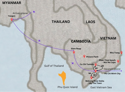 The beauty of MYANMAR - CAMBODIA - VIETNAM --- 10 DAYS / 9 NIGHTS --- YANGON - SIEM REAP - HO CHI MINH CITY - CU CHI TUNNELS - MEKONG RIVERS / MY THO