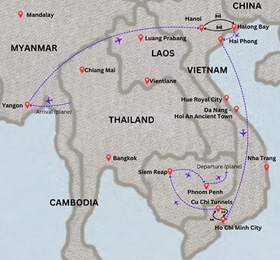 MYANMAR - VIETNAM - CAMBODIA discovery --- 11 days / 10 nights --- YANGON - GOLDEN ROCK - BAGO - HANOI - HALONG BAY - HO CHI MINH CITY - CU CHI TUNNELS - SIEM REAP - PHNOM PENH Day 01: ARRIVAL IN YANGON (by A/C car) Arrival in Yangon by OR918 ETA 06.25. Warm welcome to everybody, a moment of courtesy meeting of the tour guide in the meeting point's Yangon Airport. Yangon has been the capital of Myanmar since the middle of the 19th century when the British transformed it into their administrative centre of Further India. Its impressive colonial and spiritual heritage makes Yangon one of the most fascinating capitals of South East Asia. Transfer to the hotel for early check in and time of rest. In the afternoon, enjoy a tour to discover the colorful capital of Myanmar with a close looks at the local life of this historical city. By car and partly on foot this tour takes Sule pagoda in the middle of the city, walk around to see the Mahabandoola Park, the colonial courthouse and the city hall. Then visit the Botataung Pagoda then visit to bustling Botataung harbour. Visit the Shwedagon Pagoda since its golden dome rises 98 meters and is covered with 60 tons of pure gold. Finally, enjoy photographing with the great back view of the scenic Royal Lake. Tonight, you should enjoy dinner show with Myanmar traditional music which would be a right choice. (see supplement). Drive back to the hotel and free time at night. Overnight in Yangon.