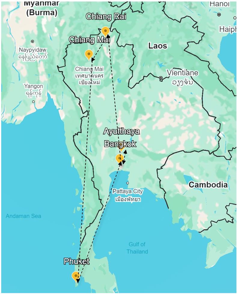Day 1 (2025): ARRIVAL IN BANGKOK (by flight, A/C coach)